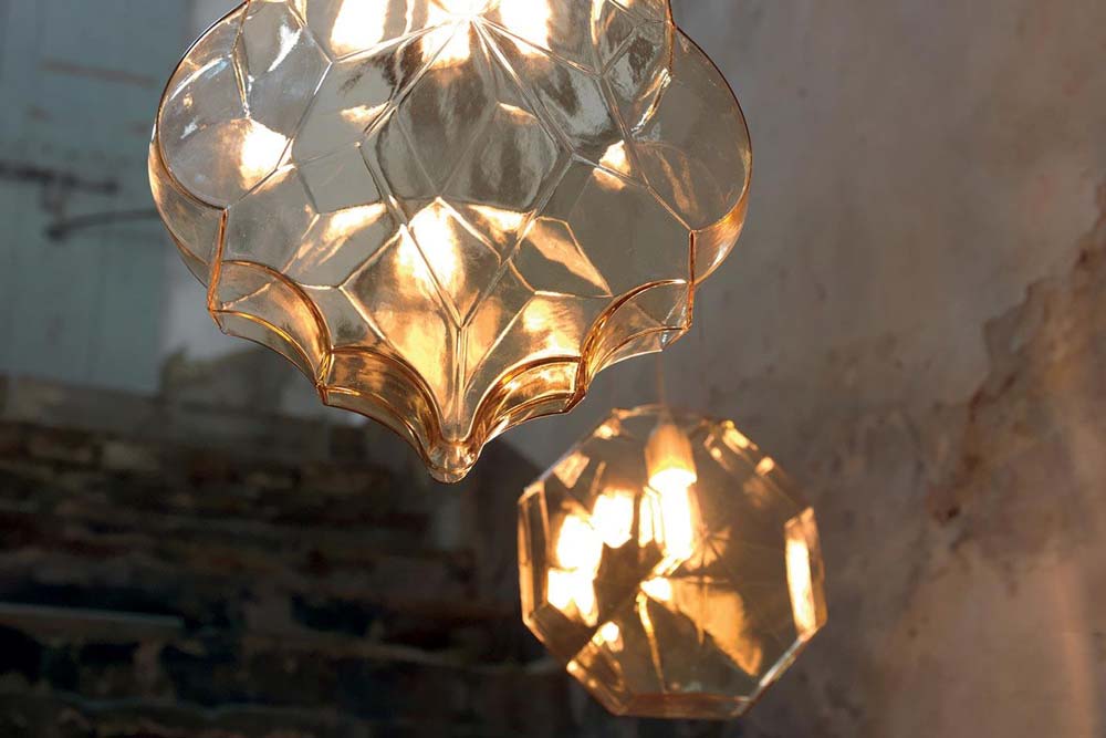 Lampada a sospensione in vetro fumè o giallo paglierino, con cavo elettrico trasparente allungabile fino a 200 cm.