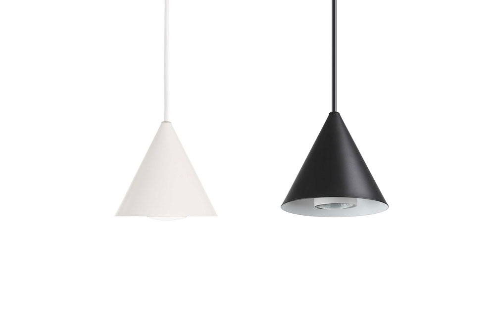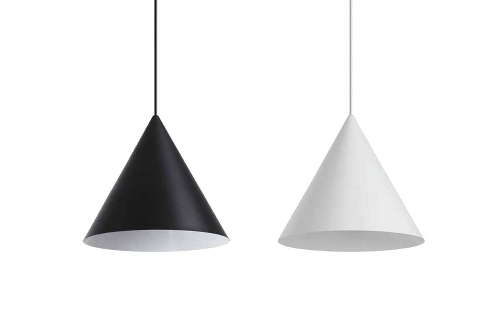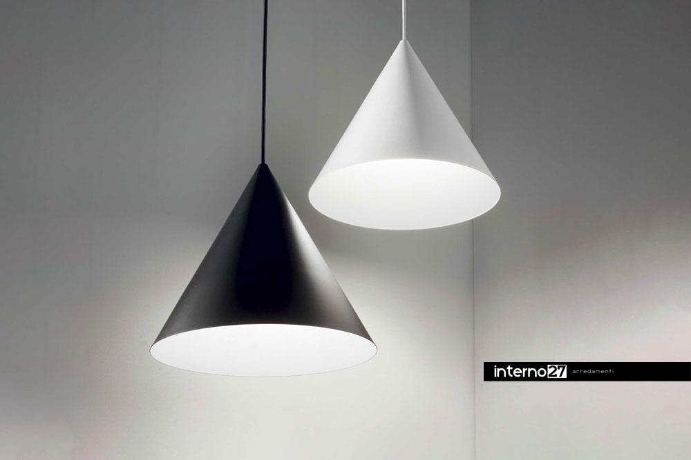 Lampada a sospensione con diffusore in metallo verniciato bianco o nero opaco con interno bianco e cavo elettrico rivestito in tessuto.