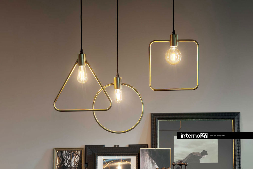 Lampada a sospensione con rosone e struttura decorativa interamente in metallo in ottone satinato e cavo in tessuto nero, allungabile fino a 240 cm. Disponibile in 3 varianti (cerchio – quadrato – triangolo).