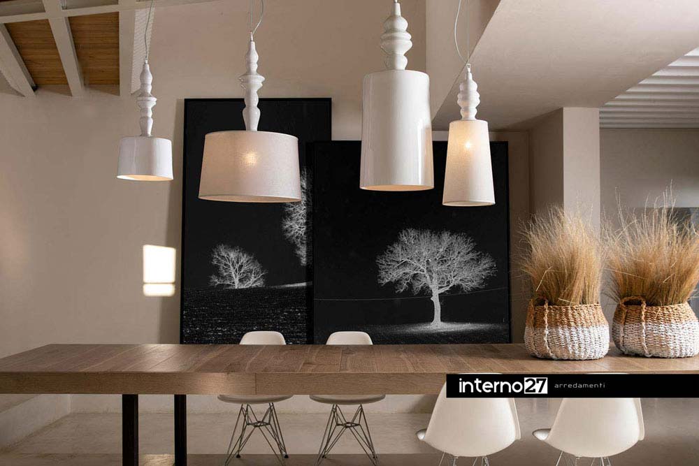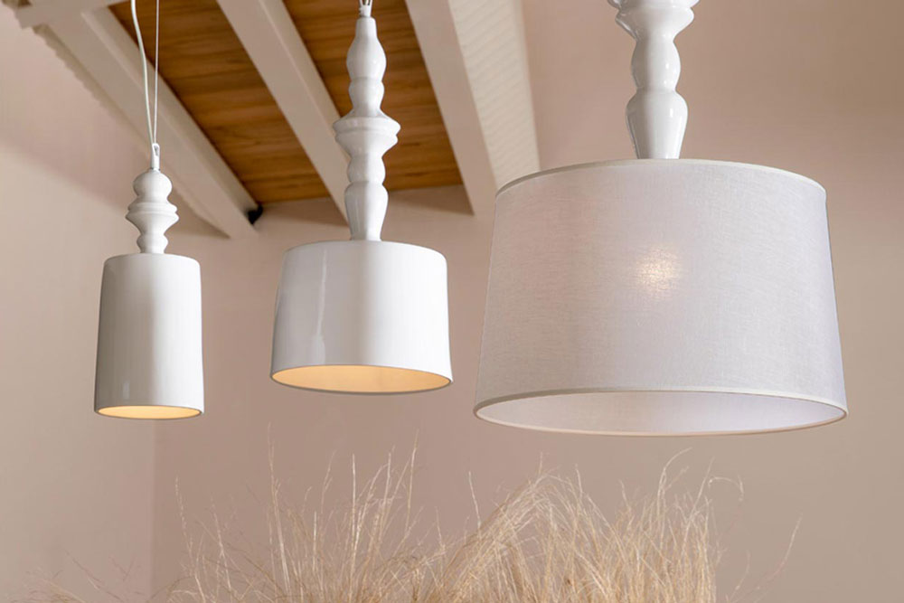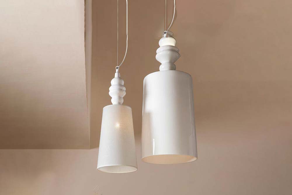 Lampada a sospensione con struttura in ceramica bianco lucido e paralume in ceramica bianca o in lino bianco.