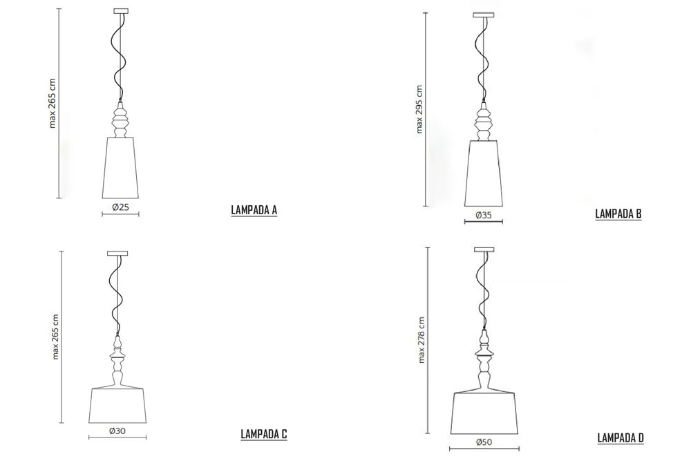- Lampada D : Ø50 cm – H.78 cm – Cavo elettrico trasparente allungabile fino a 200 cm.