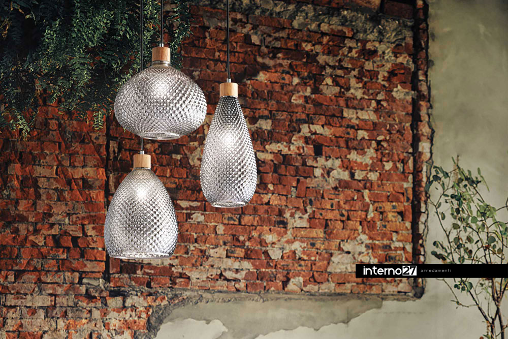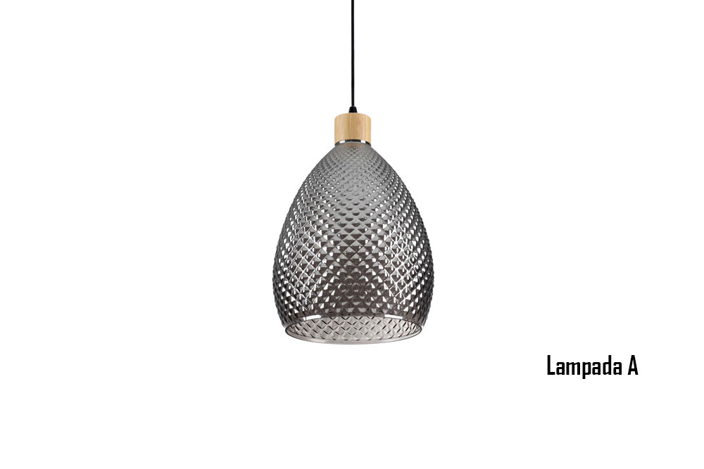 Lampada a sospensione con montatura in legno naturale e diffusore in vetro soffiato trasparente con motivo decorativo in rilievo a finitura fumè.