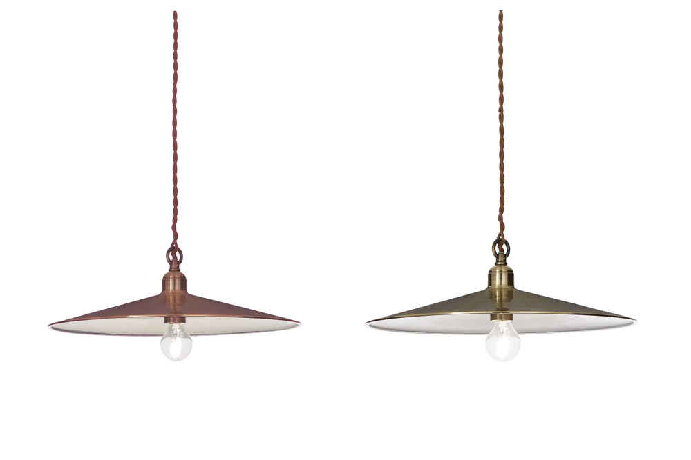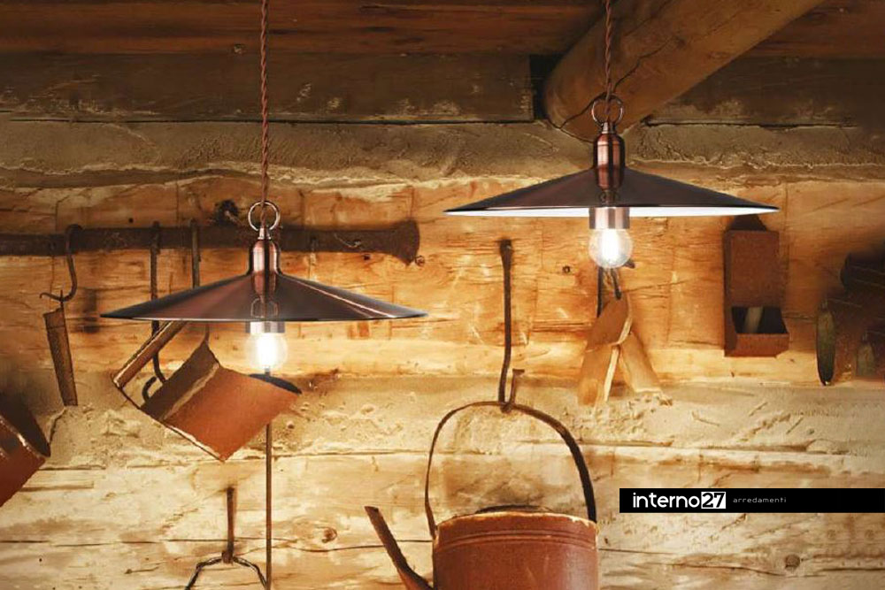 Lampada a sospensione con montatura e diffusore in metallo in finitura brunito o rame e cavo elettrico rivestito in tessuto e intrecciato.