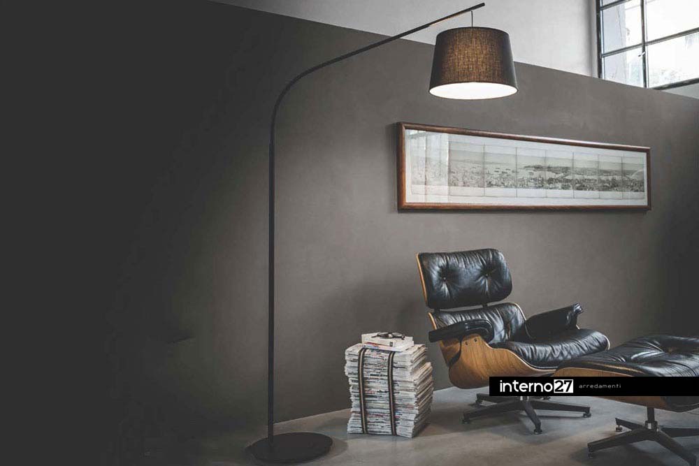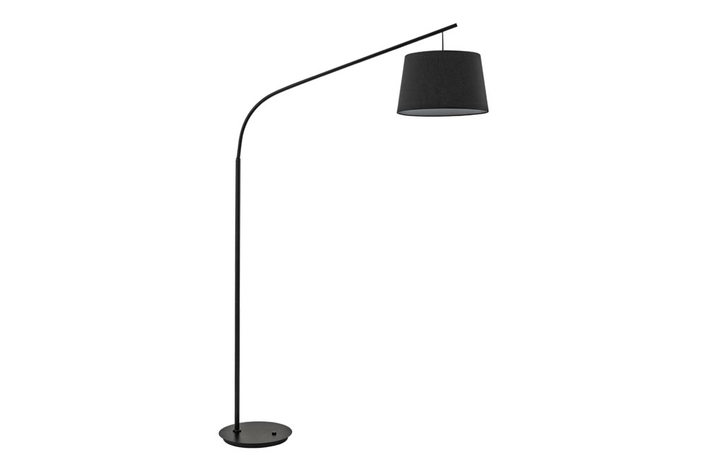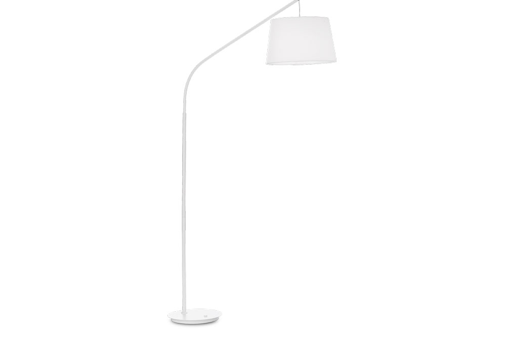 Lampada da terra ad arco con struttura in metallo e paralume in tessuto, disponibile in bianco o nero opaco.