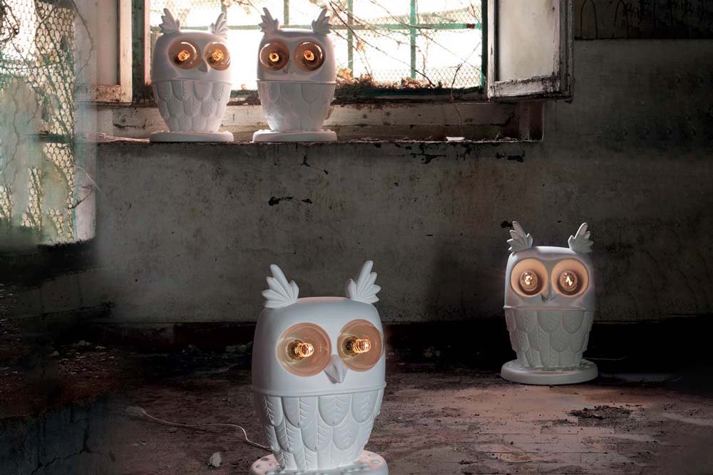 Lampada da tavolo o da terra in ceramica bianca opaca rappresentante un gufo, con cavo elettrico trasparente allungabile fino a 200 cm.