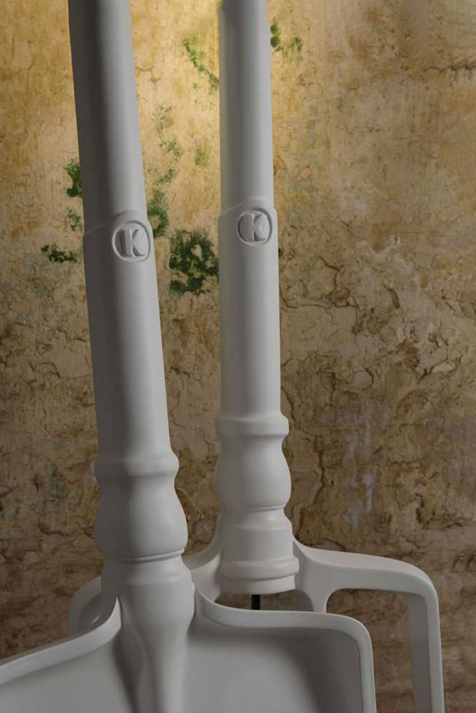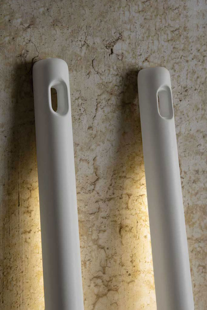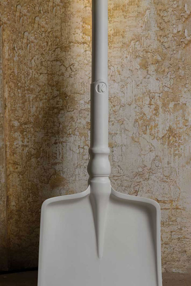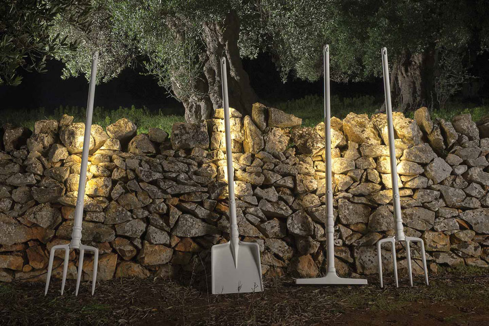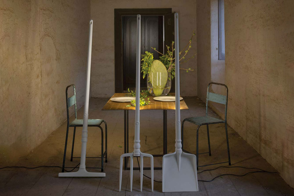 Lampada da terra in tecnopolimero bianco opaco, in 3 diverse varianti: Rastrello, Pala e Forcone, utilizzabile sia per interno che per esterno.