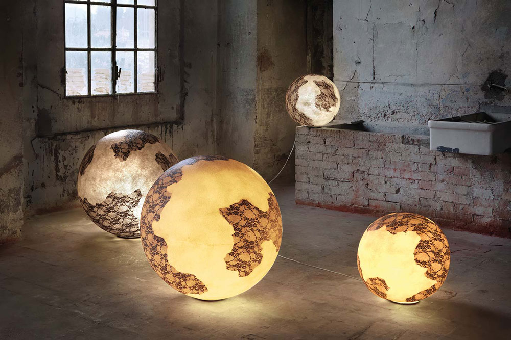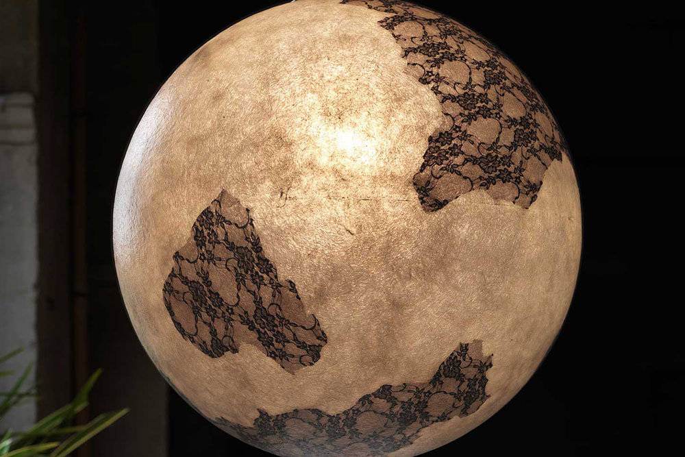 Lampada da terra in vetroresina con inserti in pizzo, con cavo elettrico nero allungabile fino a 400 cm.