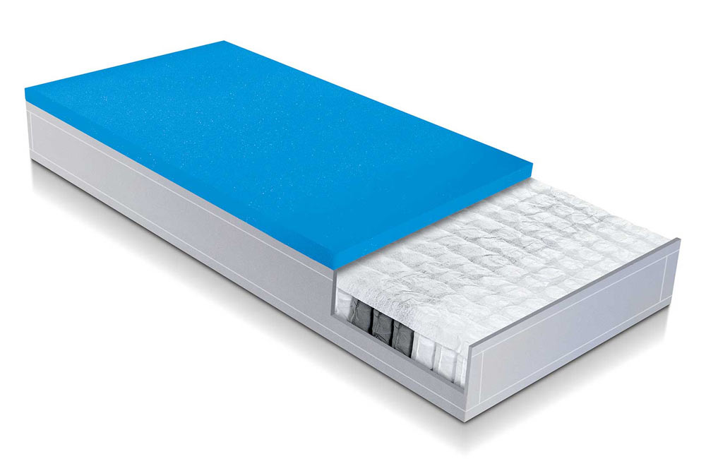 Materasso composto da una lastra in Memory Acquagel integrata da 800 molle insacchettate indipendenti e da una lastra in Acquapur ad alta densità di 3 cm ognuna.